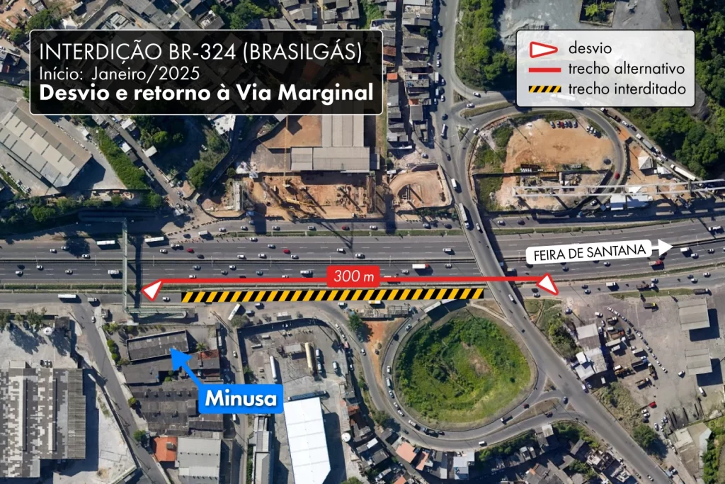 O tráfego na via marginal da BR-324, sentido Salvador-Feira de Santana, antes do viaduto da Brasilgás, será alterado temporariamente a partir deste sábado (18), às 8h da manhã. Esta mudança no fluxo vai permitir a continuidade das obras de duplicação da adutora principal de água tratada que atende Salvador e RMS. A interdição começará na via marginal, na altura da empresa Minusa, onde os veículos deverão retornar por um acesso provisório à BR, com possiblidade de voltar à marginal logo depois do viaduto.