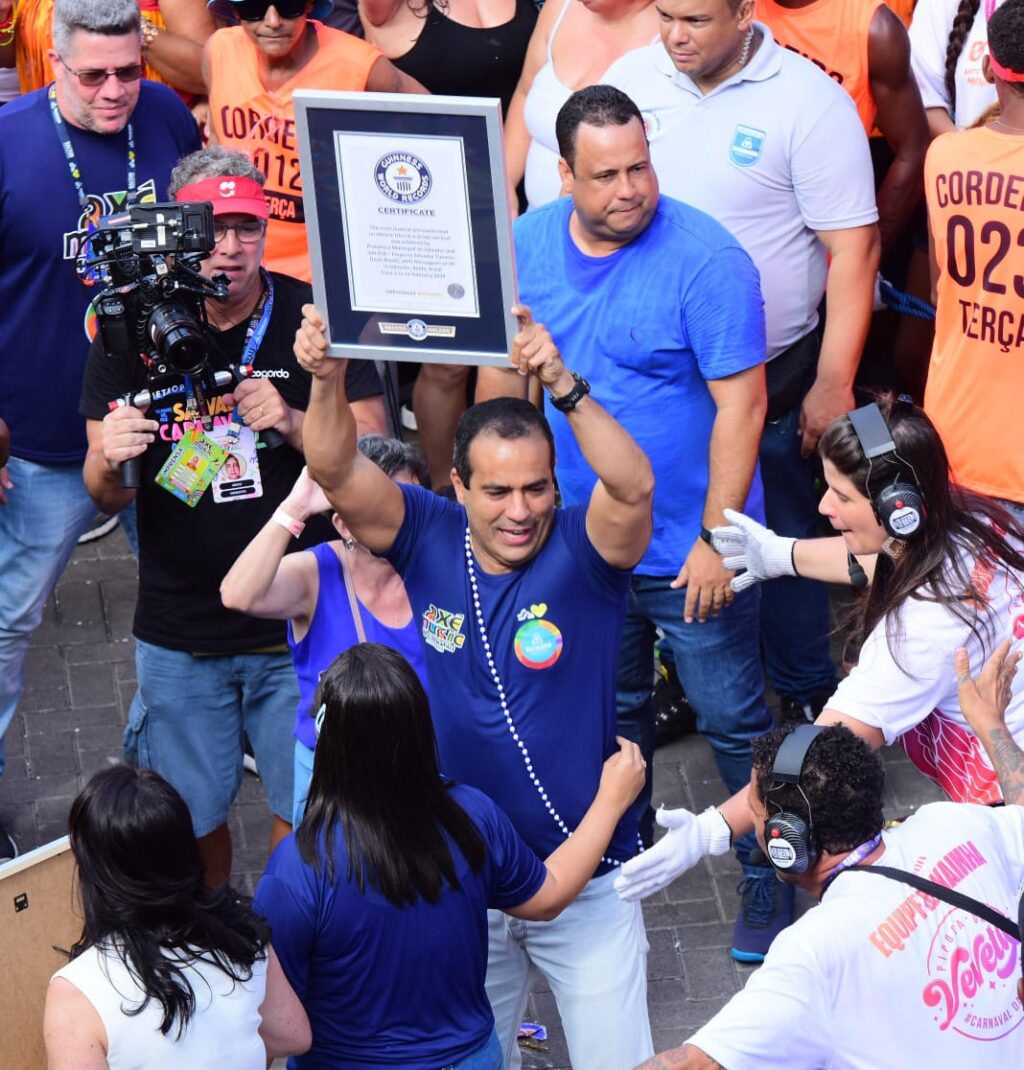Acabou a discussão: Salvador foi reconhecida nesta terça-feira (4) pelo Guinness World Records como a cidade com o Maior Carnaval de Trio Elétrico do Mundo. O certificado foi entregue ao prefeito Bruno Reis durante a pipoca de Ivete Sangalo no Campo Grande, arrastando uma multidão, e contou com a presença de uma jurada da maior autoridade de recordes do planeta.