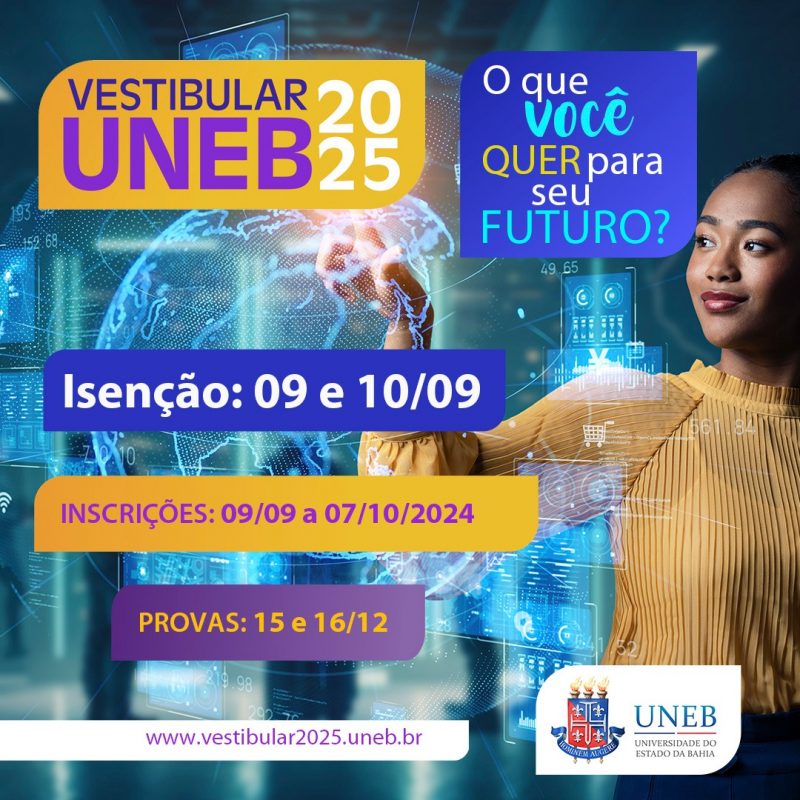 A Universidade do Estado da Bahia (Uneb) abriu, nesta segunda-feira (9), as inscrições para o Vestibular 2025. Os interessados devem se inscrever até o dia 7 de outubro, exclusivamente pelo site vestibular2025.uneb.br. Estão sendo ofertadas 6.346 vagas para o processo seletivo, sendo 4.371 para cursos de graduação na modalidade presencial, outras 1.975 oportunidades para os cursos na modalidade a distância pelo Sistema Universidade Aberta do Brasil (UAB).