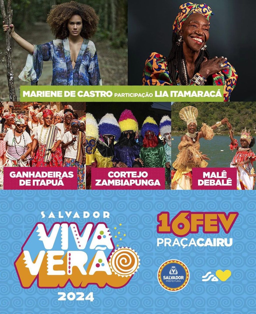 Dia 16 (sexta-feira) – Malê Debalê / Cortejo Zambiapunga / Mariene de Castro convida Lia de Itamaracá / Ganhadeiras de Itapuã